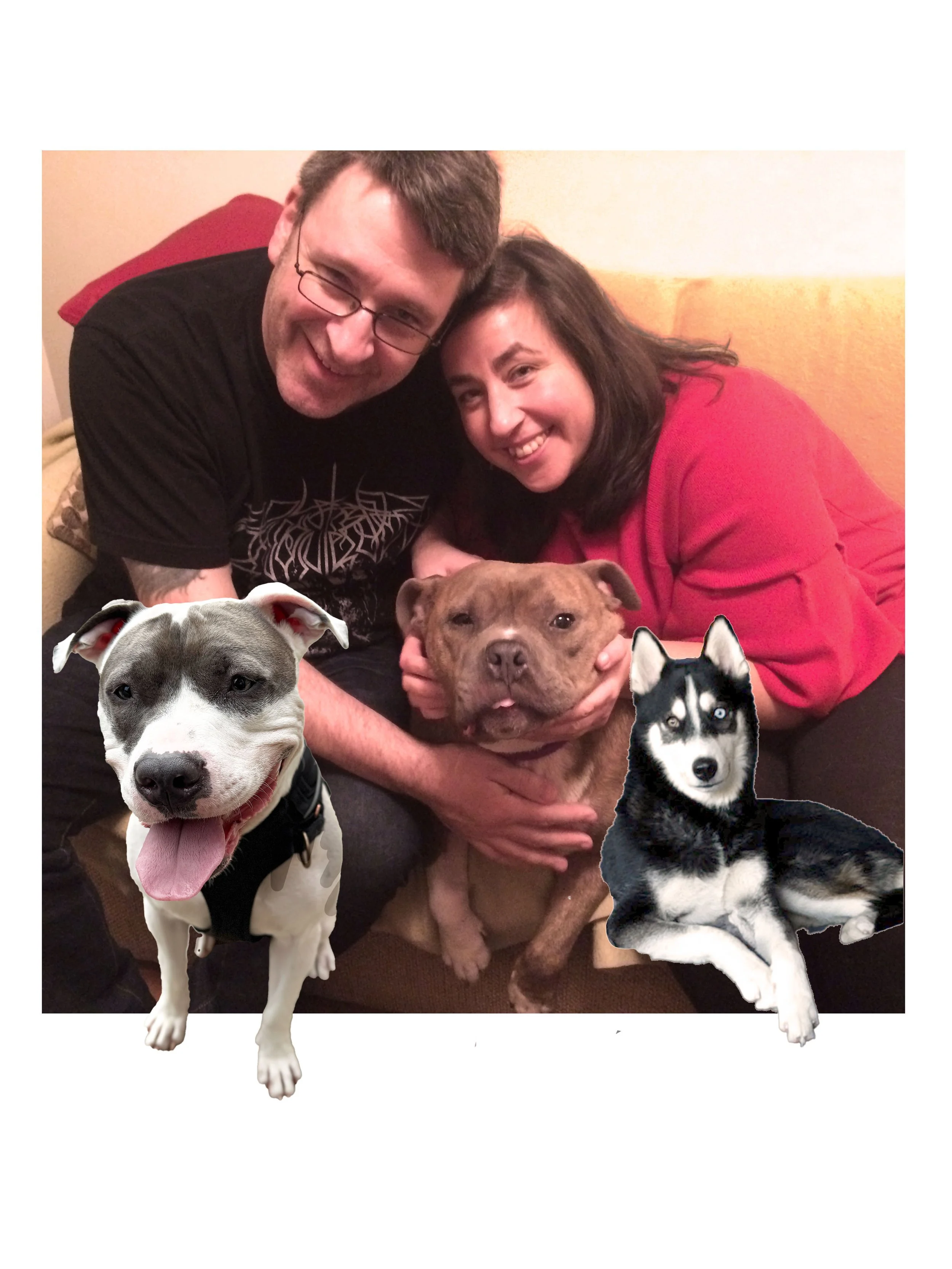 I live in Carnegie, Pennsylvania — that’s the Pittsburgh metro area — with my little family, pictured here. From the left, there’s Ed, me, propping up Maggie-the-dog’s head for the camera.